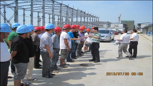 同樣,新廠工地建設(shè)者的安全問題、工程進(jìn)度和質(zhì)量問題也是廠領(lǐng)導(dǎo)十分關(guān)心的大事。7月30日上午,冒著37度的高溫,廠長(zhǎng)董風(fēng)林同志帶領(lǐng)王京洲、朱金玉、孫永泉等廠領(lǐng)導(dǎo)趕到位于江寧科學(xué)園的新廠建設(shè)工地,親切看望和慰問了工程隊(duì)的工人、工程監(jiān)理、項(xiàng)目跟蹤審計(jì)人員以及企業(yè)新廠建設(shè)辦的同志們,為他們帶去了企業(yè)的關(guān)心和問候,送去了慰問品。董廠長(zhǎng)在詳細(xì)了解了工程進(jìn)度情況以后,特別關(guān)注安全生產(chǎn)情況,實(shí)地檢查了工地的安全,并再三叮囑在場(chǎng)所有參與施工單位的同志,一定要注意安全,有針對(duì)性地組織安全大檢查,同時(shí),做好防暑降溫工作,要確保施工安全、工程質(zhì)量安全、食品安全,保證按進(jìn)度和要求完成工程建設(shè)周期。