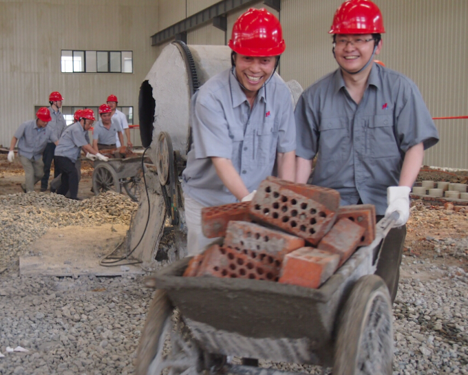 一到新廠建設(shè)工地,領(lǐng)導(dǎo)們在新廠建設(shè)辦工作人員的引導(dǎo)下,直接來到建設(shè)中的廠房工地現(xiàn)場,大家分成兩組,一組扎鋼筋,一組搬運磚塊。扎鋼筋可是技術(shù)活,在工人師傅的指導(dǎo)下,大家認真學(xué)習,掌握要領(lǐng),迅速干起活來,勞動過程中,大家還不時交流,提高工作效率;搬運磚塊的領(lǐng)導(dǎo)們個個爭先恐后,往推車里裝磚、推車、卸車一氣呵成,個個干得汗流浹背。兩個組在勞動中途又進行了交換,使參加勞動的領(lǐng)導(dǎo)們有了更豐富的勞動實踐。通過參加勞動,大家為新廠建設(shè)出一份力,流一點汗,以自己的勞動參與促進新廠建設(shè)進度。