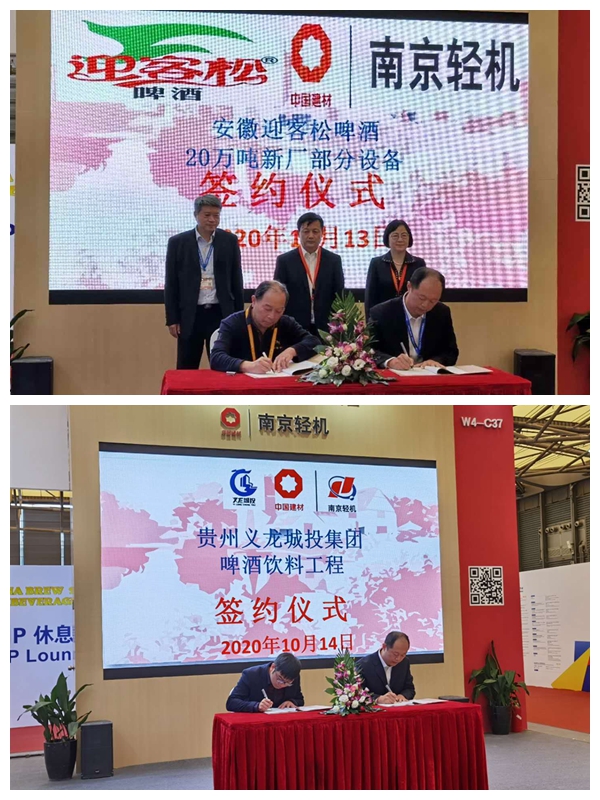 展會現(xiàn)場捷報頻傳,南京輕機與安徽迎客松啤酒就20萬噸新廠部分設備舉行簽約儀式,與貴州義龍城投集團就啤酒飲料工程簽約。盧黨軍、王欣等領導共同見證簽約儀式。今年10月新增訂單創(chuàng)歷史新高。來參觀的客戶一直絡繹不絕,受到廣大客戶的一致好評。