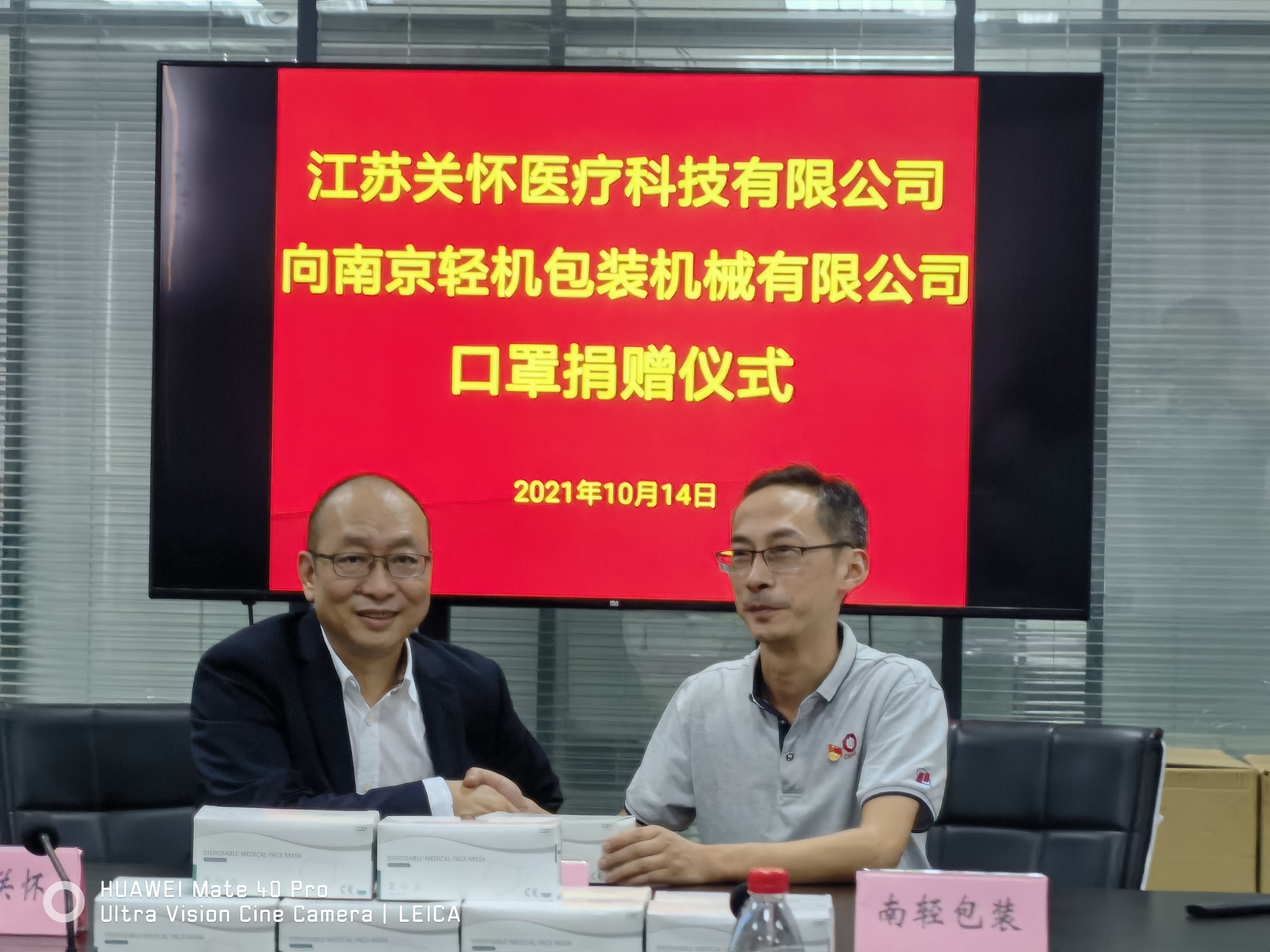 會后還舉行了江蘇關(guān)懷醫(yī)療贈送南京輕機2萬只出口型口罩的交接儀式。