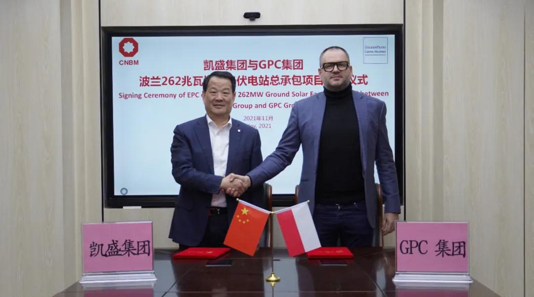 ? 中國工程院院士、中國建材集團總工程師、凱盛科技集團董事長彭壽與GPC集團主席Daniel Tain代表雙方簽訂波蘭262MW地面光伏電站項目總承包合同。