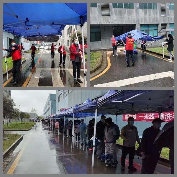 天公不作美,此時(shí)風(fēng)大雨急,給露天排隊(duì)等候核酸檢測(cè)人員帶來(lái)了不小的影響,南京輕機(jī)黨員志愿者們迅速組織起來(lái),冒雨搭建帳篷。由于前天夜里剛下了一場(chǎng)大雨,使得早晨的氣溫驟降了十多度,但瑟瑟的寒風(fēng)擋不住志愿者們的熱情,他們幾人一組,協(xié)同配合,動(dòng)作嫻熟,任憑雨水?濕了頭發(fā)和衣裳也沒(méi)有一人退縮,不一會(huì)一頂頂帳篷順利搭建完成。志愿者們又馬不停蹄,頂風(fēng)冒雨投入到了核酸檢測(cè)服務(wù)當(dāng)中去,他們有的負(fù)責(zé)大門(mén)口檢查“健康碼”、“行程碼”,把好入口的第一道防線(xiàn);有的負(fù)責(zé)維持秩序,嚴(yán)守待檢人員“一米線(xiàn)”的規(guī)定;有的不厭其煩的提醒大家準(zhǔn)備好身份證或檢測(cè)碼,并主動(dòng)幫助初使者學(xué)習(xí)如何打開(kāi)檢測(cè)碼,大大提高了檢測(cè)效率。此時(shí)雨越下越大,而周邊單位和居民也越集越多,但在一頂頂帳篷下,大家都在耐心等待,秩序井然,只有風(fēng)雨中每個(gè)志愿者身上那件印有“南京輕機(jī)黨員志愿者”標(biāo)志的紅馬甲顯得更加鮮艷奪目。在醫(yī)護(hù)人員和志愿者的共同努力下,當(dāng)天南京輕機(jī)檢測(cè)點(diǎn)共完成了2500多人的第二次核酸檢測(cè),為全市防疫抗疫貢獻(xiàn)了南輕力量。