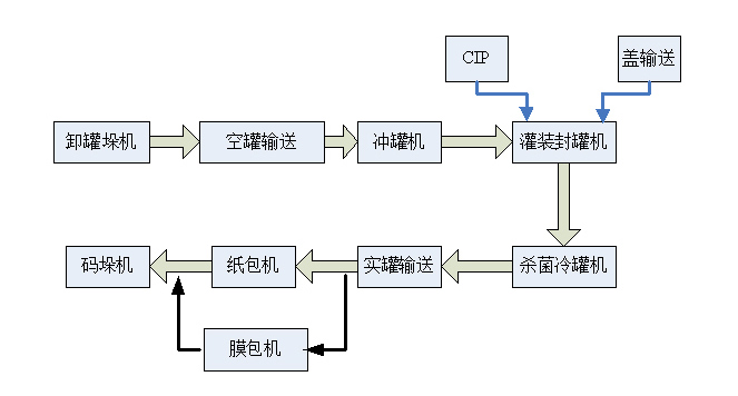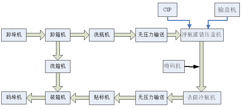 b)生產(chǎn)線主要設(shè)備組成:卸垛機(jī)、沖罐機(jī)、灌裝封蓋機(jī)、殺菌冷罐機(jī)、紙箱包裝機(jī)(膜包機(jī))、碼垛機(jī)、瓶箱輸送機(jī)、清洗系統(tǒng)等