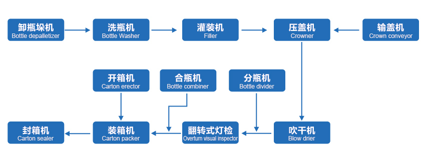 2、生產(chǎn)線主要設(shè)備組成:卸瓶垛機、洗瓶機、灌裝壓蓋(旋蓋)機、貼標機、裝盒機、紙箱包裝機、碼垛機、瓶箱輸送機、輸蓋機等;